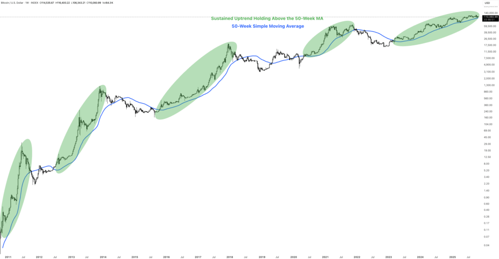 Bitcoin (BTC) has always followed a simple rule. When it trades above the 50-week moving average, the trend remains intact. When it closes two consecutive weeks below it, the cycle usually shifts into a bear market.