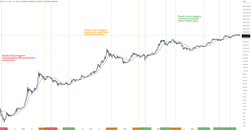 Another key development is the upcoming death cross, when the 50-day and 200-day moving averages intersect. For most assets, this crossover marks the start of prolonged declines. Bitcoin, however, behaves differently.