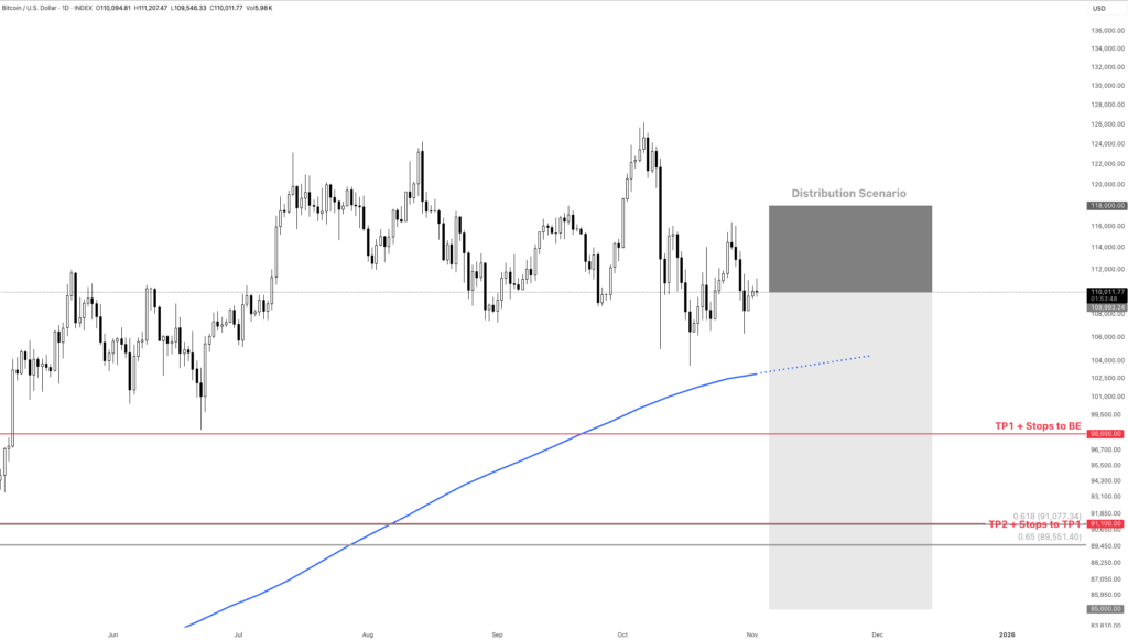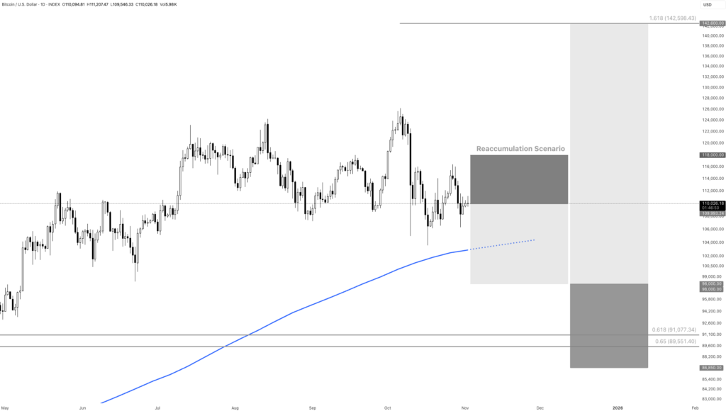 When we combine that with the fact that Q4 in post-halving years has almost always been bullish, the probabilities lean toward this being reaccumulation, not distribution. In this case, the market would likely experience a sharp panic-driven selloff below $100,000, possibly near $98,000, before recovering.