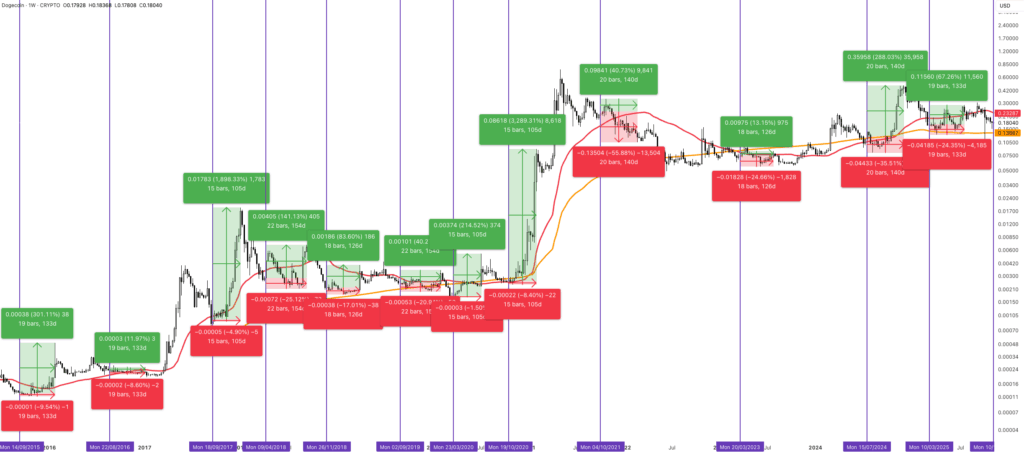 Based purely on statistics, DOGE offers a repeatable long edge after the signal. On the downside, the average move lower following death crosses stands at roughly 20%, but recent crosses created declines of up to 35%.