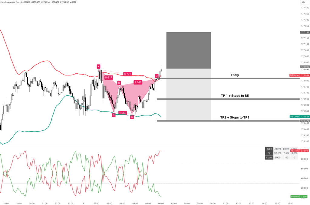 A completed bearish Gartley pattern has appeared on the EURJPY 5-minute chart, with the pattern’s endpoint at 176.814. Historically, harmonic formations, such as the Gartley have an 80% probability of success.