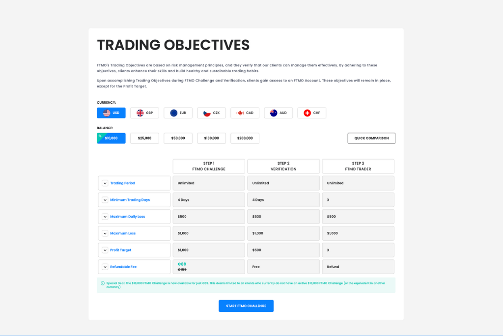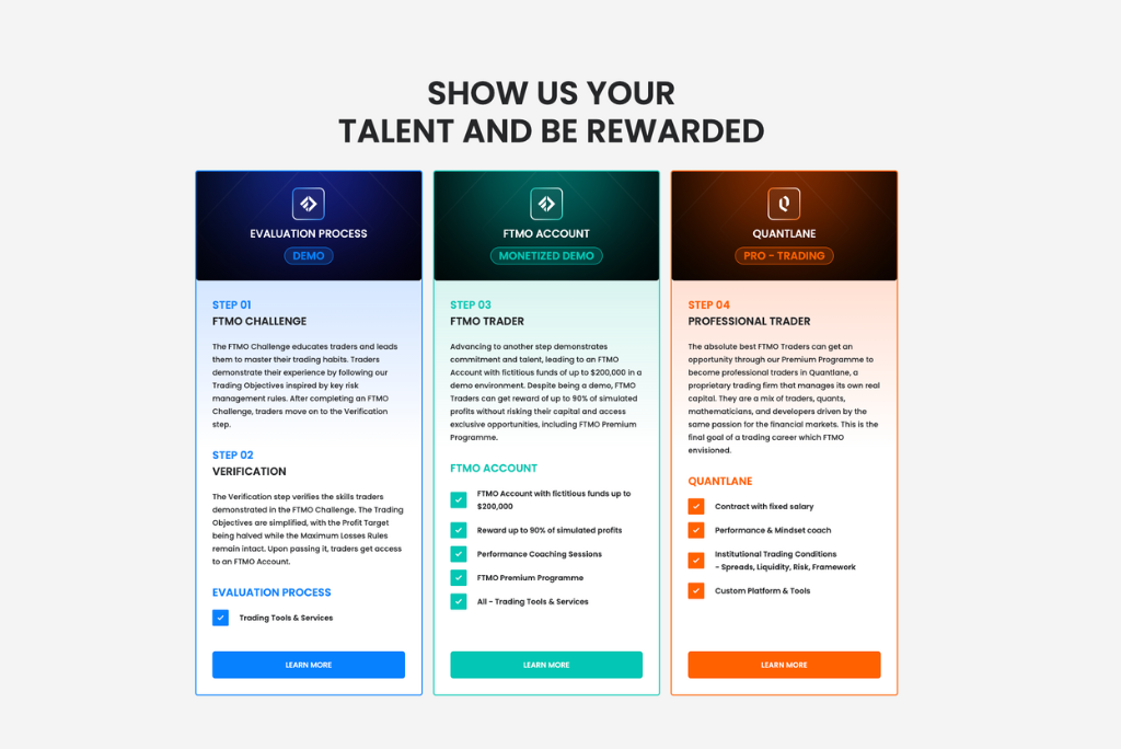 FTMOの主な魅力は、さまざまなスキルレベルのトレーダーに対応するように設計された1ステップ、2ステップ、およびダイレクトファンディングプランにあります。2段階のチャレンジプロセス(FTMOチャレンジと検証)では、トレーダーは最初のステップで 10%、次のステップで 5% という利益目標を達成する必要があります。この構造化されたアプローチは、資格のないトレーダーを除外すると同時に、真に可能性を秘めたトレーダーが自分の能力を証明できるよう支援します。成功したトレーダーには 80% の利益配分が与えられ、これを最大 90% までスケールアップして一貫したパフォーマンスを得ることができます。