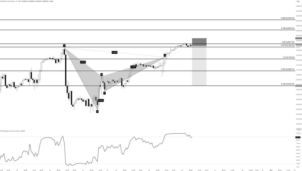 The S&P 500 futures is flashing a clean bearish mean-reversion setup, framed by a harmonic and stretched intraday momentum. A bearish bat harmonic has completed around 6,753 and has yet to properly play out, suggesting that recent strength is likely part of a terminal rally rather than the start of a new impulsive leg higher.
