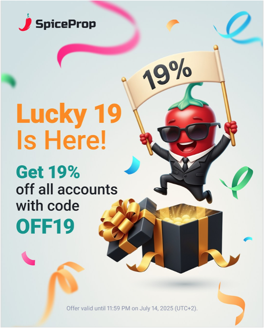 SpiceProp has announced a limited-time promotion dubbed “Lucky 19”, offering traders a 19% discount on all trading account purchases. The offer is valid until July 14, 2025, at 11:59 PM, and can be activated using the promo code OFF19.
