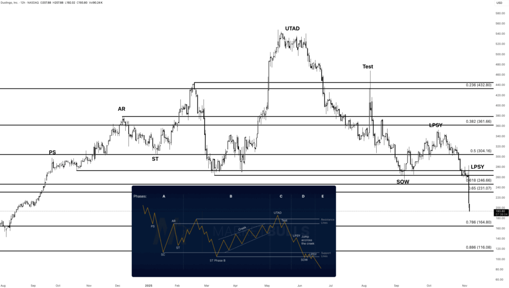 On the broader structural front, Duolingo appears to be in Phase E of a classic Wyckoff Distribution pattern, with the markdown phase now largely exhausted. This stage is where major bottoms commonly form in accumulation cycles.