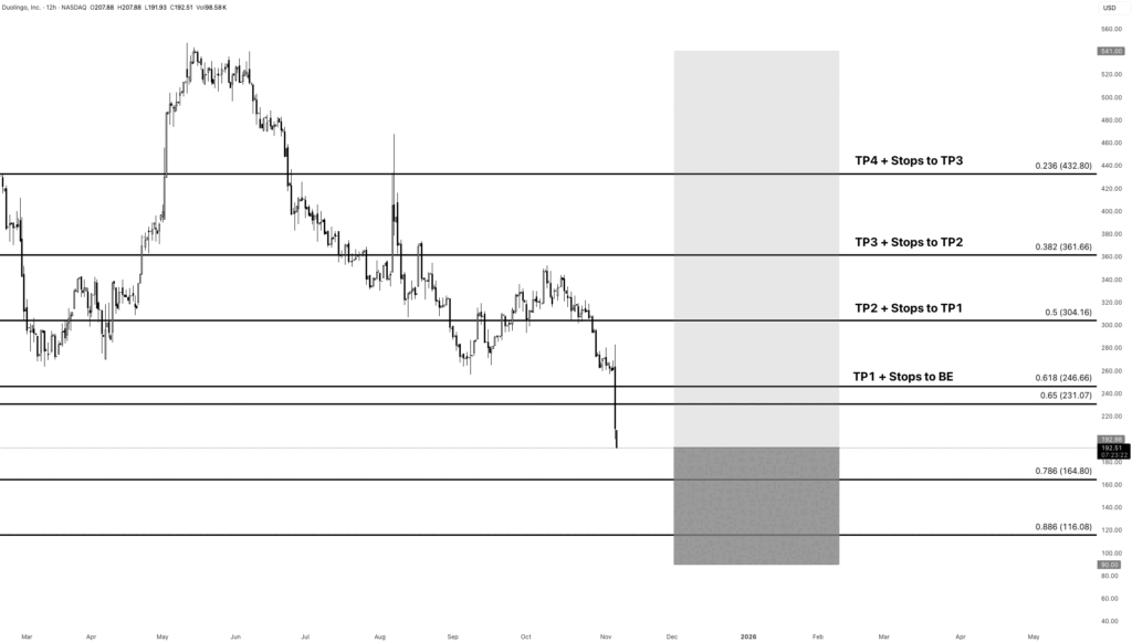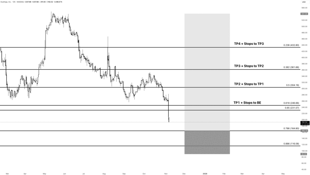 Currently, DUOL sits directly atop its 200-week moving average, which is a critical technical support. Alongside this, the Fibonacci retracement from all-time lows to highs places the stock in a golden pocket zone that has acted as a consistent support and reversal area.