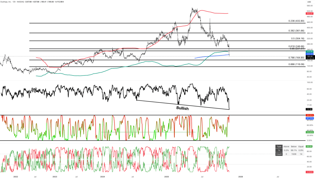 Extreme oversold conditions are building a strong technical case for Duolingo. The 12-hour Relative Strength Index (RSI) sits lower than 99% of all previous readings, marking a uniquely deep percentile in its trading history and indicating the potential for a local bottom.